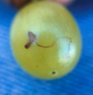 Síntomas y daños: Los primeros ataques se manifiestan en frutos maduros y azucarados. La picadura característicamente forma un pequeño puntiforme oscuro rodeado de halo ámbar, que progresivamente se oscurece y extiende. La presión sobre el grano libera líquido y revela galerías internas creadas por las larvas al alimentarse. Las heridas abiertas facilitan la colonización secundaria por podredumbre acida (acetobacter sp., kloeckera apiculata, sacharomycopsis vini)|hongos y bacterias, agravando la degradación del fruto.