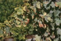 Síntomas en brotes jóvenes. Cuando el ataque ocurre en las primeras fases de desarrollo, afecta a las hojas terminales provocando decoloraciones y desecaciones marginales. Estas necrosis están delimitadas por los nervios y presentan ribetes amarillos en variedades blancas y rojos en las tintas. Asimismo, se observa crispación y enrollamiento del borde foliar hacia el envés, acompañado de entrenudos acortados y emisión de brotes anticipados.